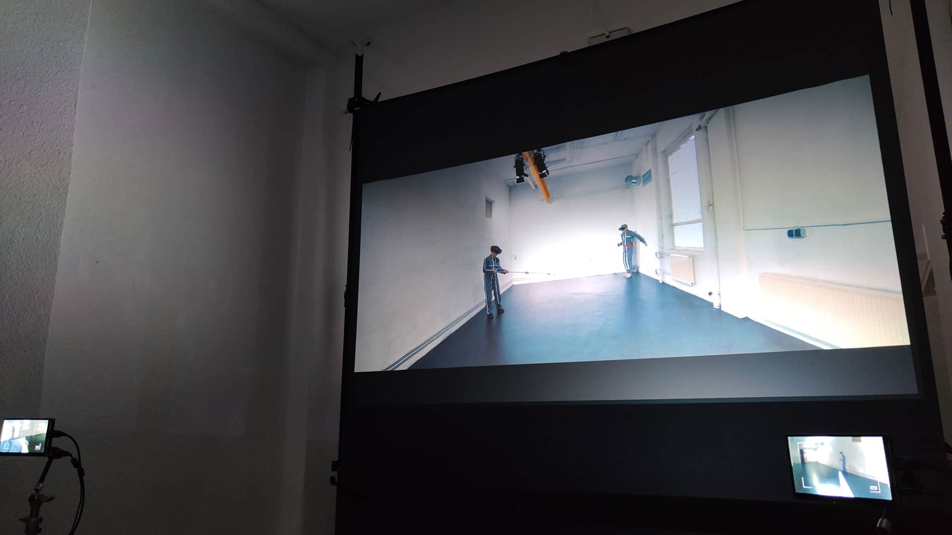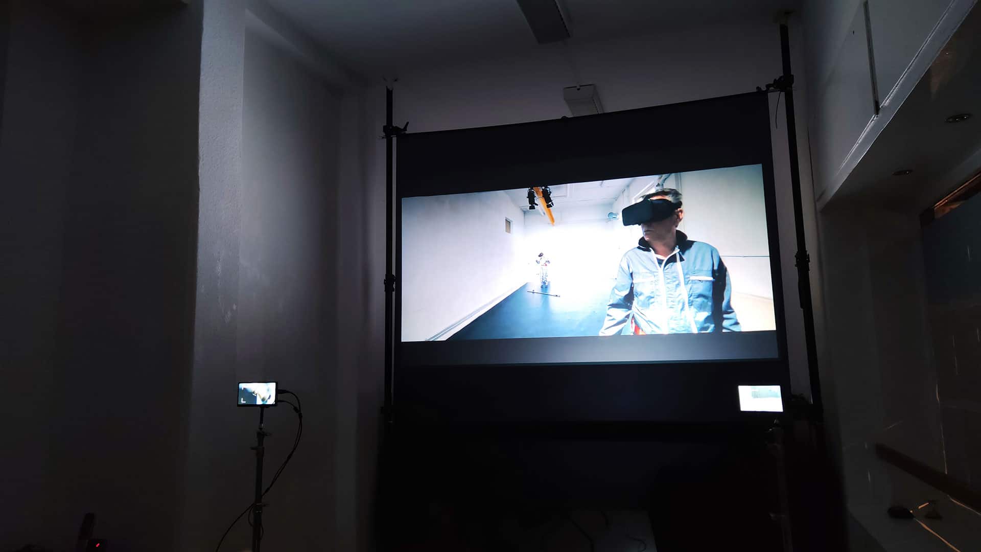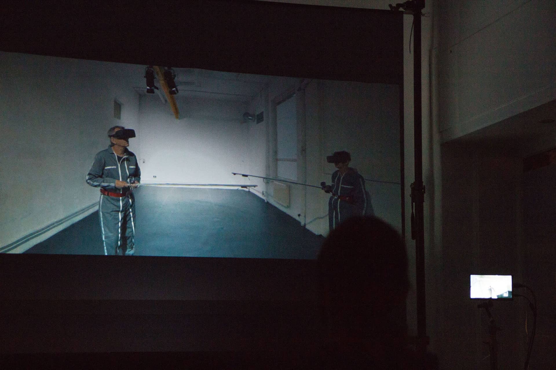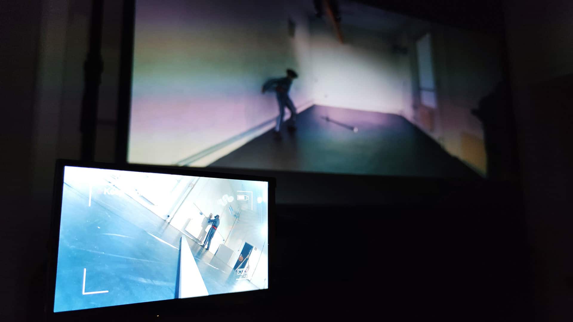 Zwei Performer*innen interagieren im Raum über VR-Brillen aus Sicht einer ihrem Körper 1,5 Meter vorgelagerten Kameraperspektive. Die Videoperformance macht sowohl beide Subjektiven, als auch beide Performer*innen in der Totalen sichtbar. Auf einer zweiten Ebene befragt die Performance, ob und wie die sogenannte „Liveness“ in einem von Abstand und medialer Vermittlung geprägten Alltag wieder gefunden werden kann.