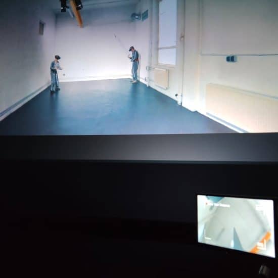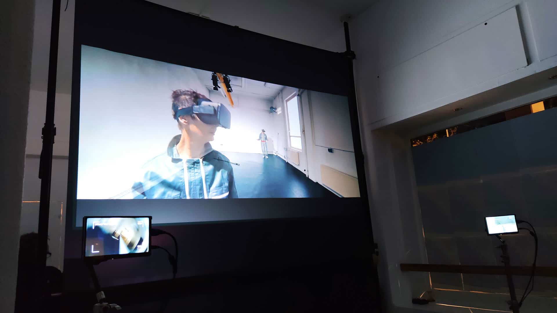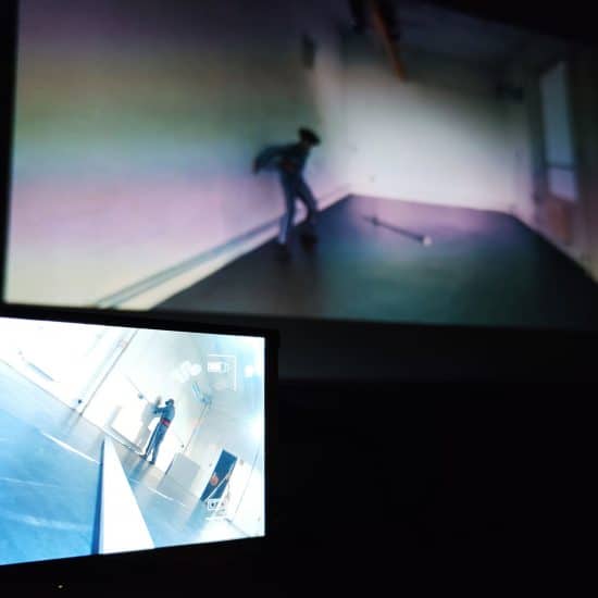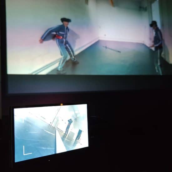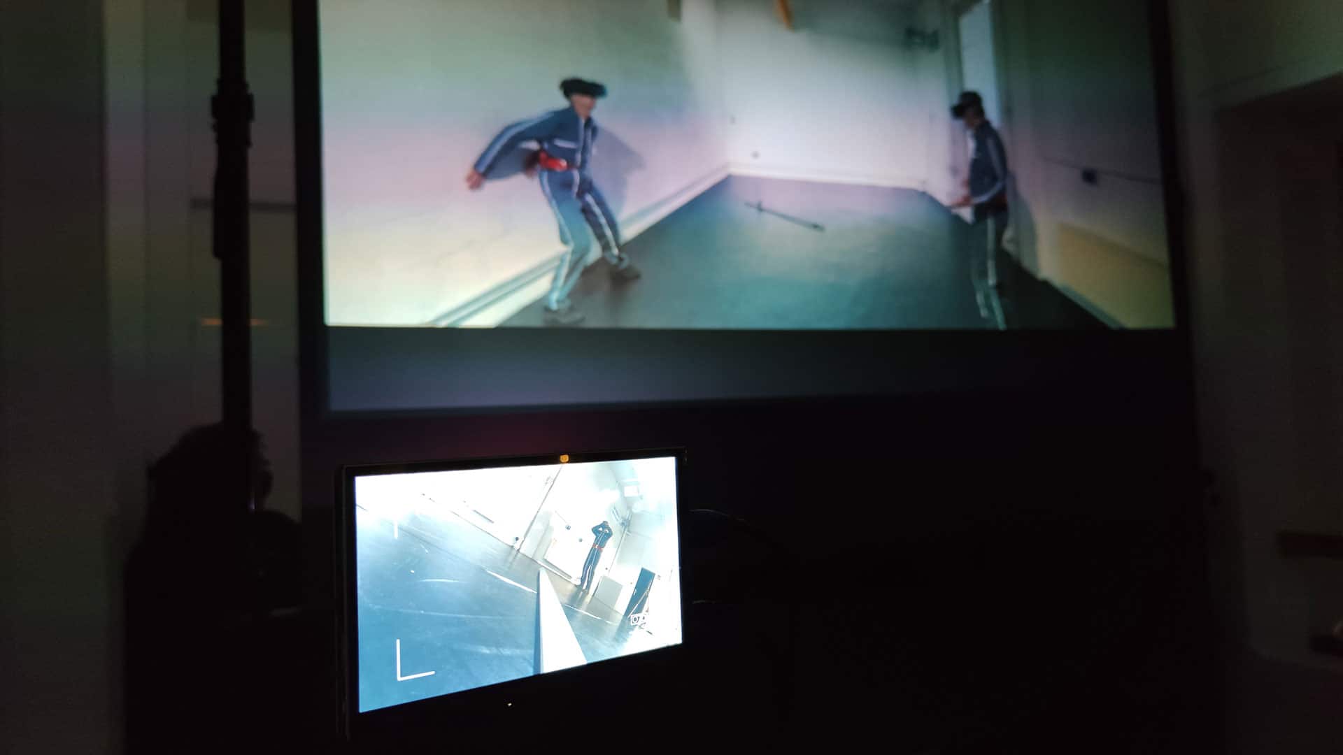 Zwei Performer*innen interagieren im Raum über VR-Brillen aus Sicht einer ihrem Körper 1,5 Meter vorgelagerten Kameraperspektive. Die Videoperformance macht sowohl beide Subjektiven, als auch beide Performer*innen in der Totalen sichtbar. Auf einer zweiten Ebene befragt die Performance, ob und wie die sogenannte „Liveness“ in einem von Abstand und medialer Vermittlung geprägten Alltag wieder gefunden werden kann.