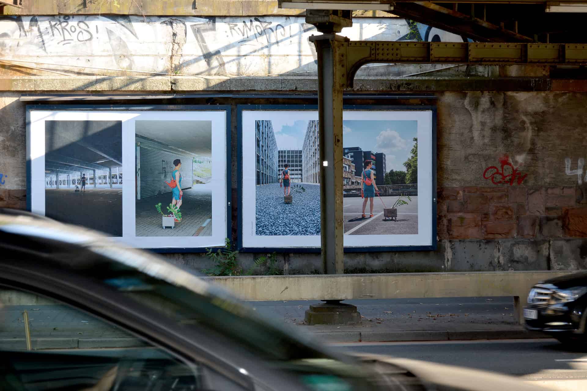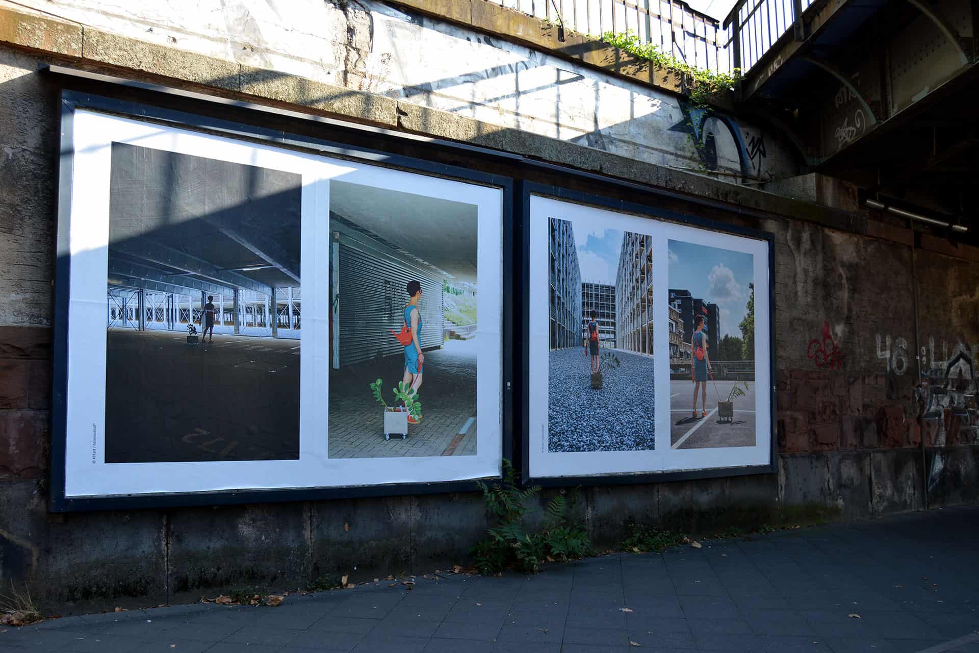 Die Performancefotos thematisieren das Zusammenleben von Pflanzen und Humanoiden im urbanen Raum. Vier Motive der fotografischen Serie sind als temporäre Intervention im September 2024 in Frankfurt/M im Rahmen des Kulturfestivals Rush Hour zu sehen.