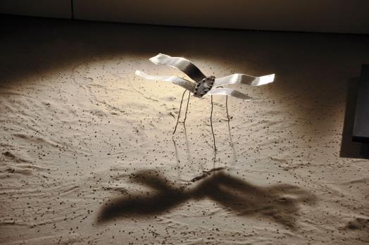 Solar Touch transferiert Lichtenergie in Bewegungsenergie. Eine Arbeit zur Interdependenz von Sonnenlicht und grundlegenden Zyklen der Natur. Kugelsolarzellen, Silizium Solarzellen, MDF, Draht, Elektronikbauteile, Sand.